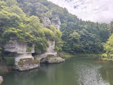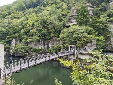 阿賀川にかけられた吊り橋で向こう側には、自然に侵食された岩壁が沢山あり全てに名前がついてるようです。