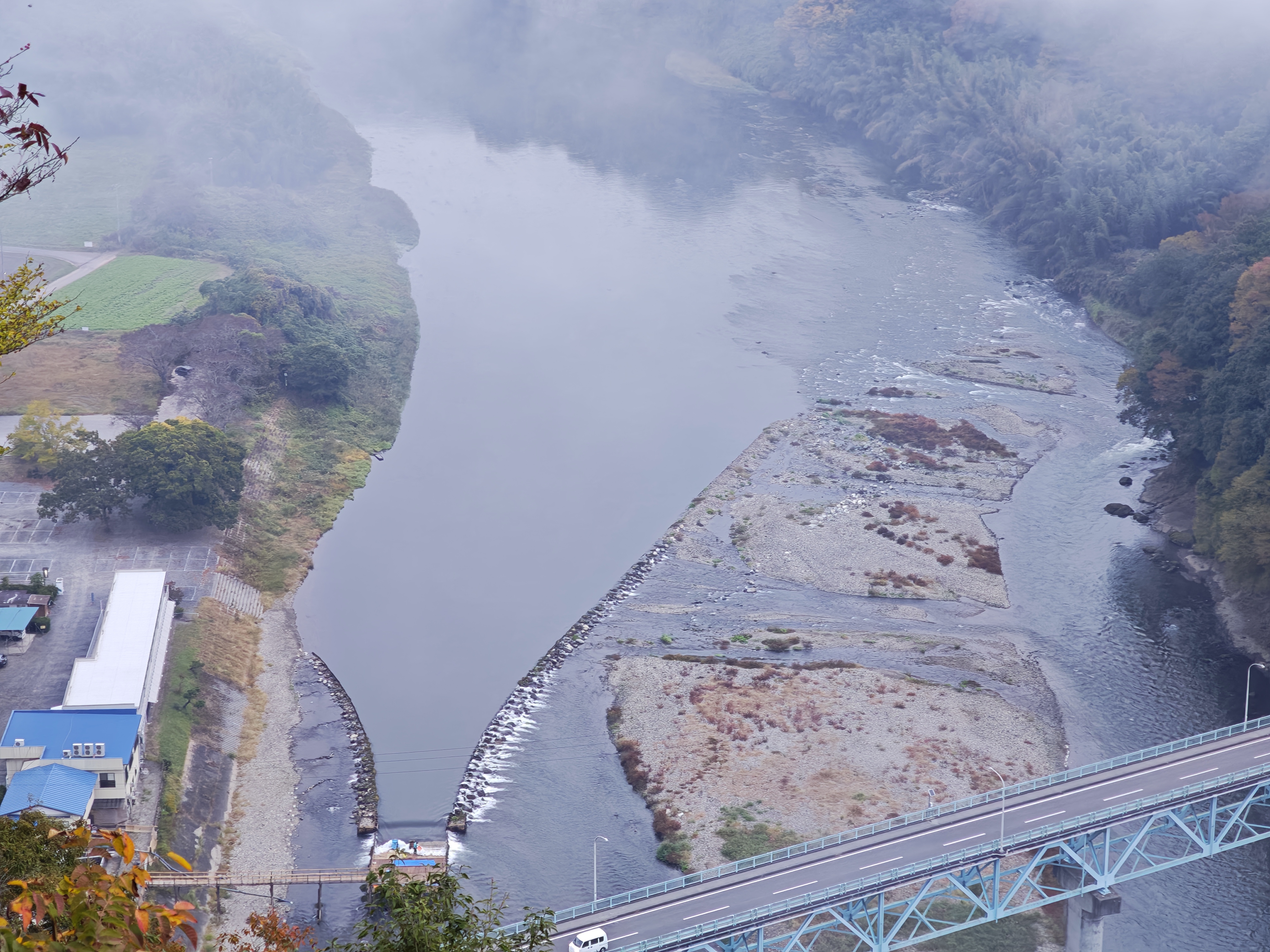 ふもとを見ると大瀬観光やなのヤナ場が見えます。