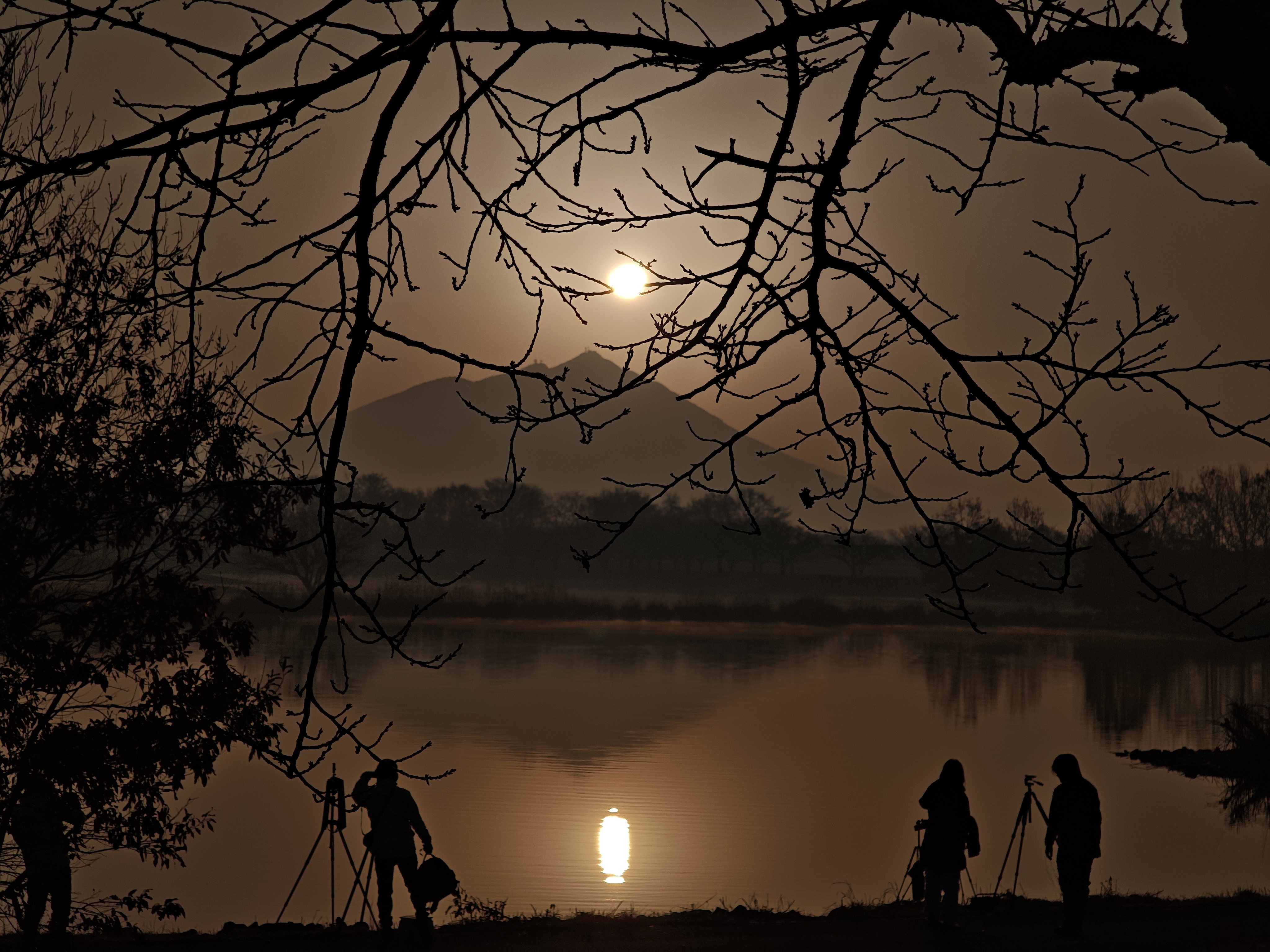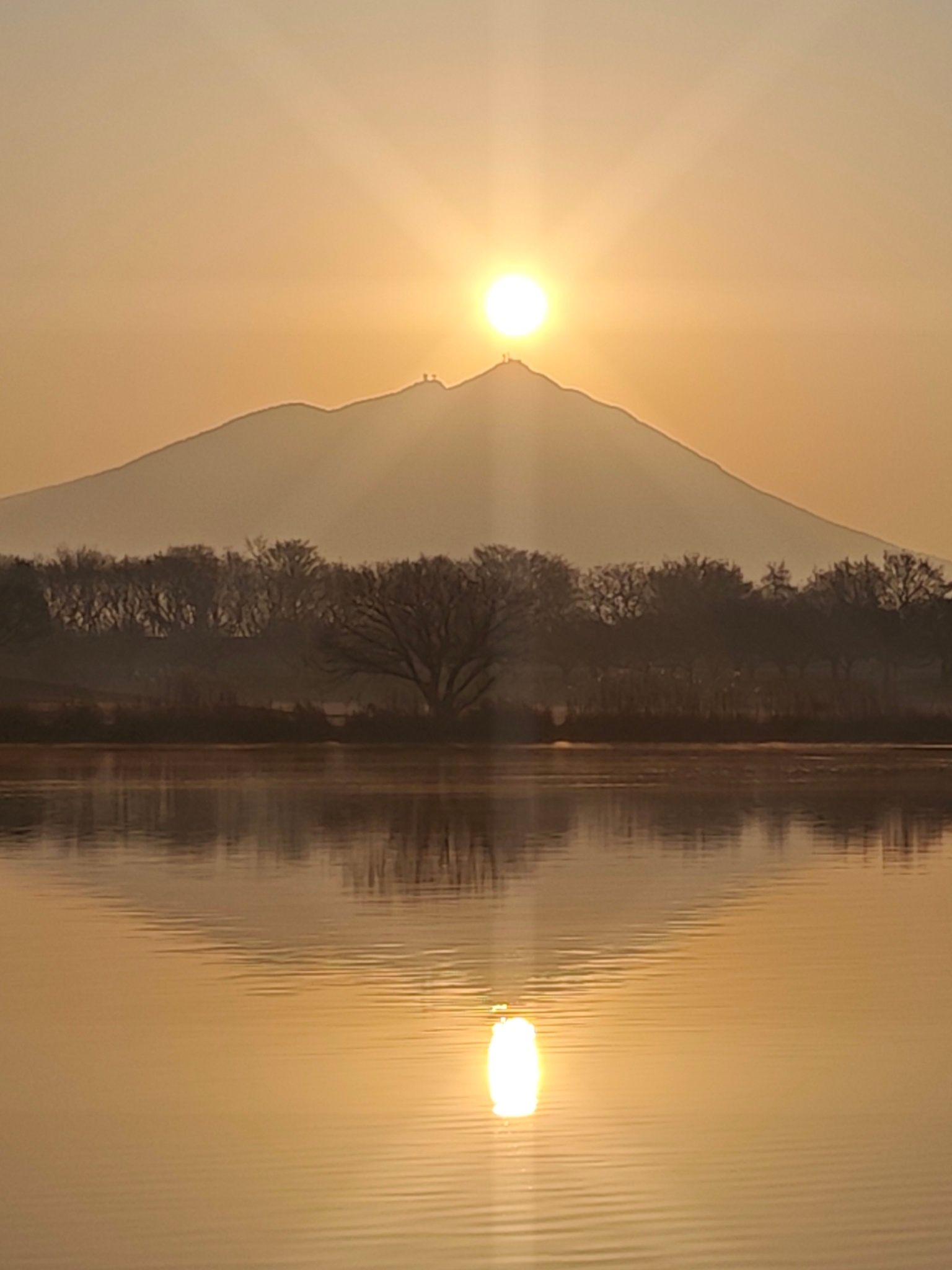 駐車場は、70台ほど停められるようで、簡易トイレが3個設置されてました。西側に臨時の駐車場が用意され警備員さんもいました。この日の日の出は平地で6:28でしたが筑波山頂に顔を出したのは6:53頃でした。初めて来たのですが、県外ナンバーの方々も、家族連れの方々も色々です。湖畔には三脚がずらりと並んでました。